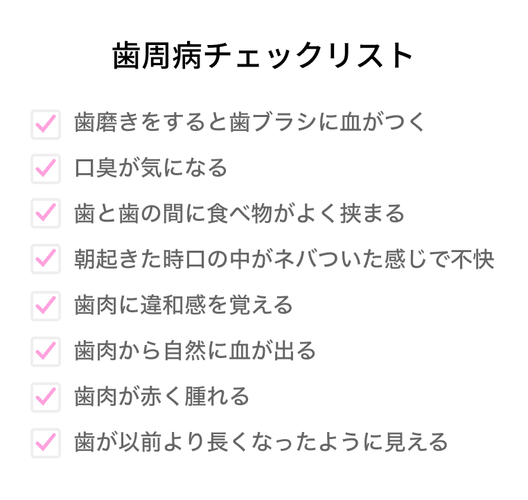 上記のチェック項目に一つでも当てはまる方は歯周病の可能性が高いですので、歯周病治療のきっかけにしてみてください。